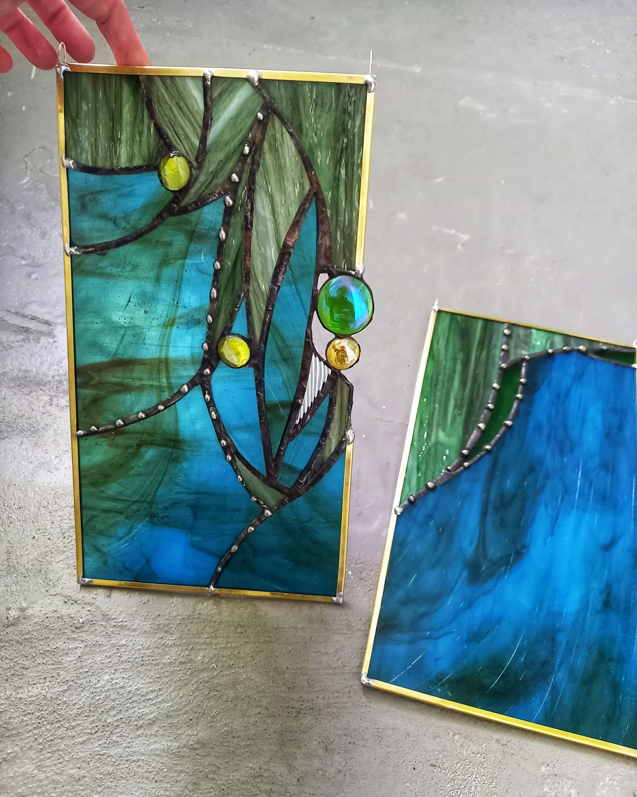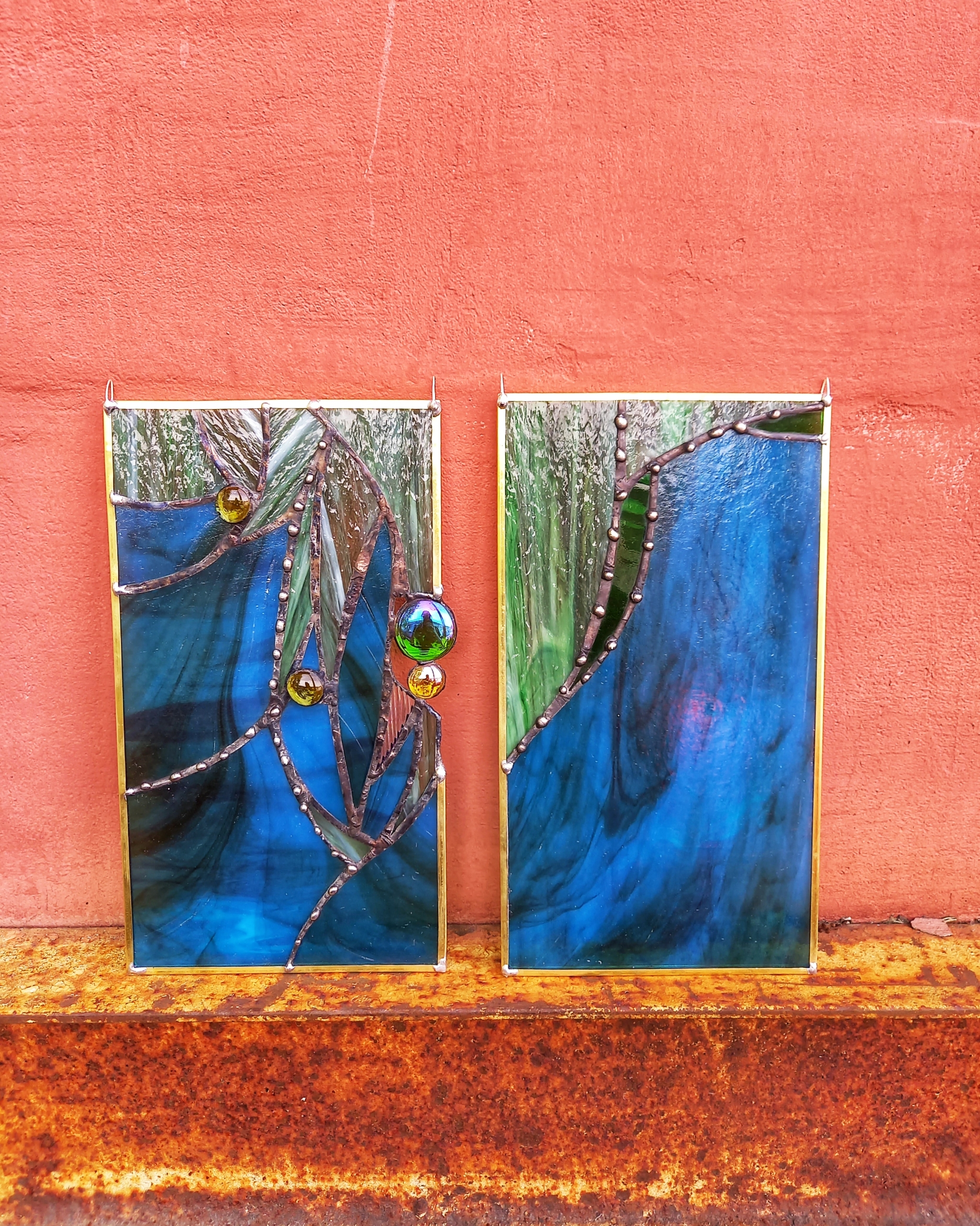 RÕÕM JA RAHU Kahest vitraažist koosnev kunstiteos. Opaalne, ehk pool läbikumav. Sobib nii akna ette kui ka seinale. Ühe vitraaž paneeli suurus: ~ 30×16,5cm