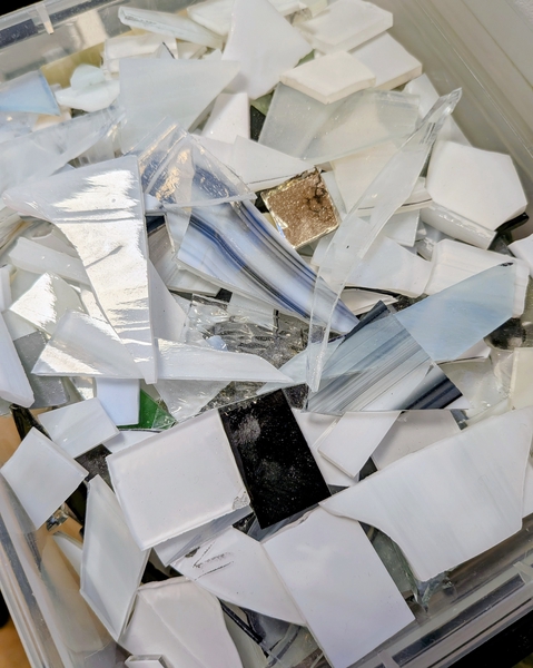 Väikeste läbipaistvate, opaaksete klaasikildude segu. Sobib mosaiigi tegemiseks. Vajalik mosaiigi tangide olemasolu, et saaks endale sobivaid kujundeid murda. VALGED, MUSTAD, HALLID, TEKSTUURSED LÄBIPAISTVAD 2,2KG