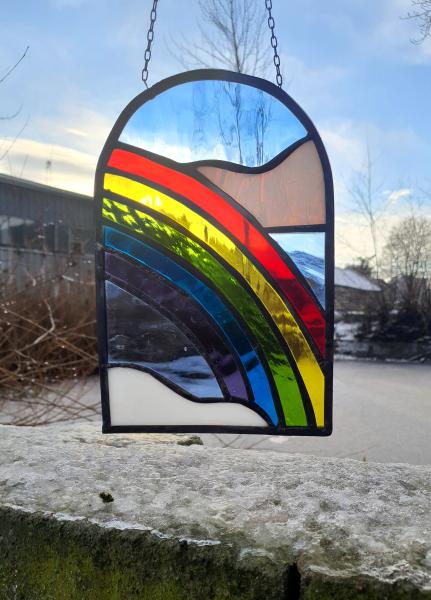 PILVEDE VAHEL Kaunis säravate värvidega viraaž “Pilvede vahel”. Vitraaži mõõdud on ~17 x 26 cm