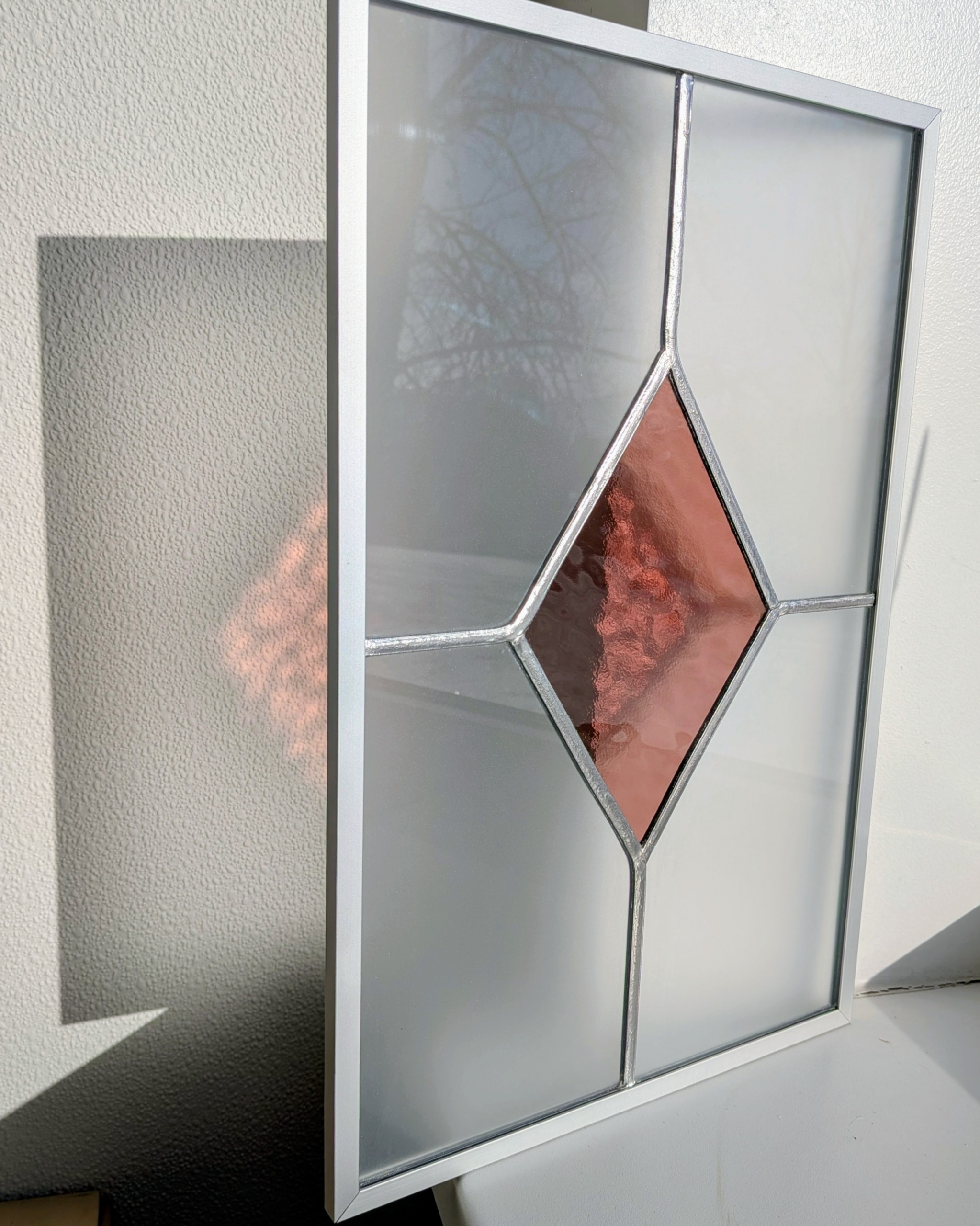 Lihtsas võtmes tinaprofiiliga vitraaž. Ümber väga kerge aga toekas alumiinium raam. Võib viia ilustuseks terassile või kasvuhoonesse, muidugi ka endale tuppa.