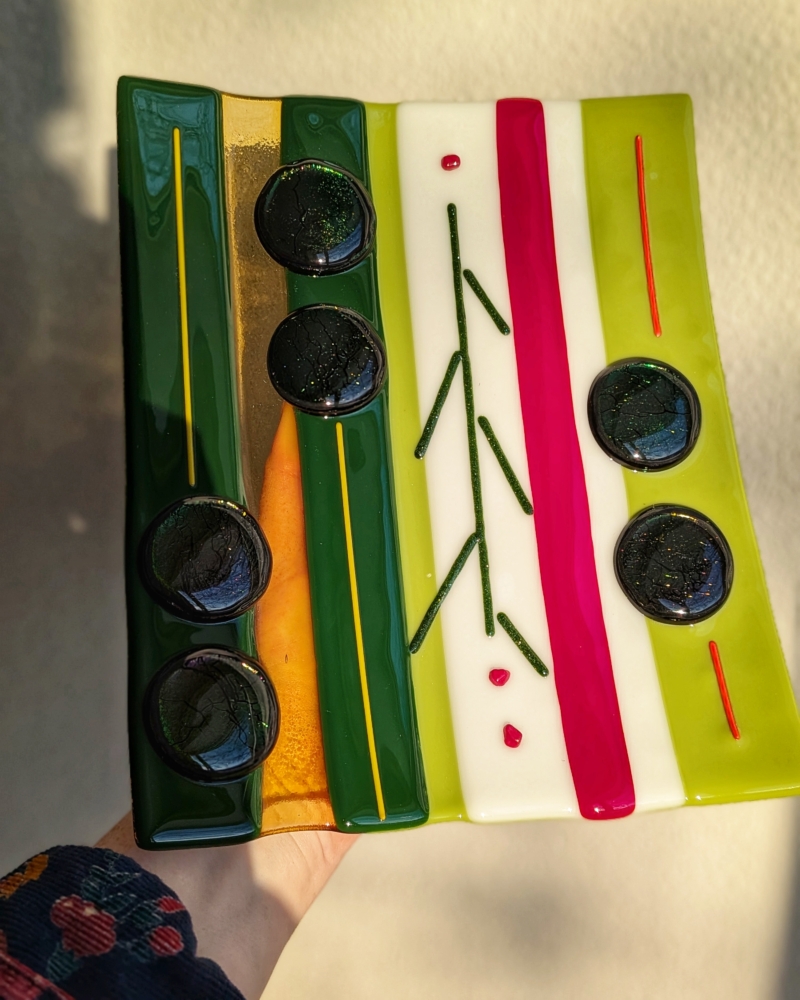 Omanäoline sädelevate mummudega klaasist alus või väiksem vaagen. Väga rõõmsates toonides, mahutamaks kõike mida hing ihaldab. Suurus: ~23,5×19,5